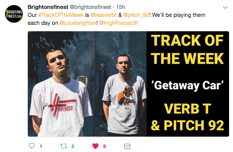 Verb T & Pitch 92 – ‘Getaway Car’ – Track Of The Week On Juice FM High Focus2017-08-02T15:00:18+00:00August 2nd, 2017|Press, Verb T| www.brightonsfinest.com