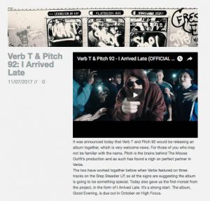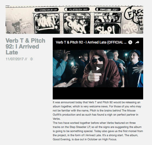 Verb T & Pitch 92 – ‘I Arrived Late’ Featured In Gingerslim High Focus2017-09-05T16:06:51+00:00July 11th, 2017|Press, Verb T| https://gingerslim.wordpress.com/2017/07/11/verb-t-pitch-92-i-arrived-late/