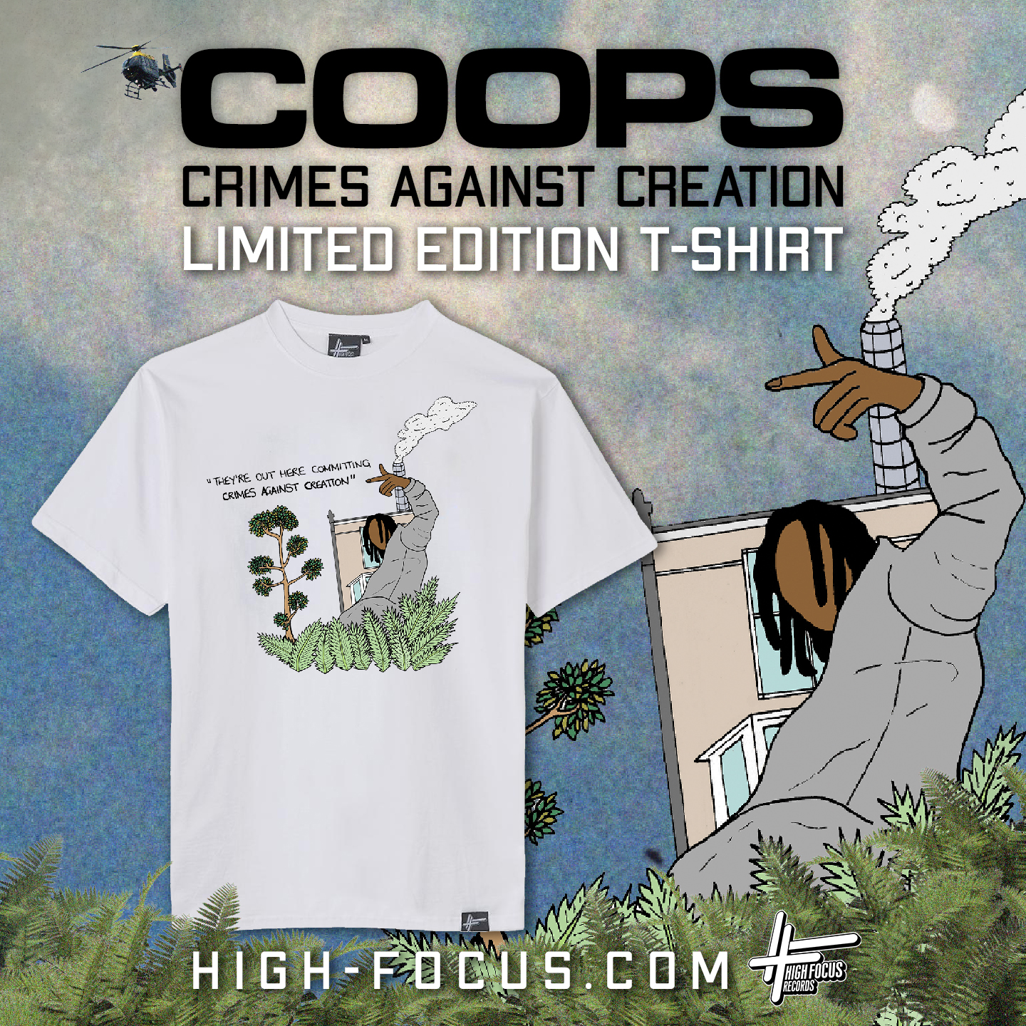 To celebrate the drop, we have just released a limited run of Coops ‘Crimes Against Creation’ t Shirts, exclusively available at the High Focus Store.