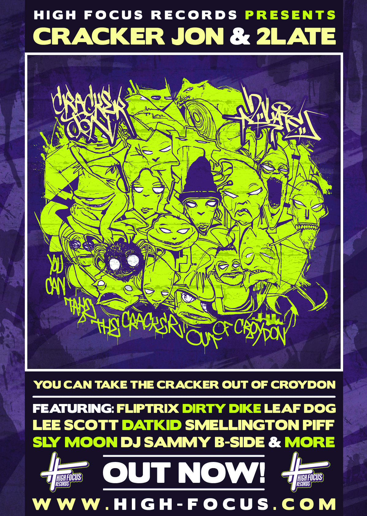 High Focus Records is proud to announce that Cracker Jon & 2Late’s debut album ‘You Can Take The Cracker Out Of Croydon’ is OUT NOW on digital, CD and limited edition vinyl! The album is entirely produced by 2Late and features the likes of Leaf Dog, Dirty Dike, Fliptrix, Lee Scott, Smellington Piff, DJ Sammy B-Side, Sly Moon, Eric Da Red, Datkid, Strange Neighbour and more!