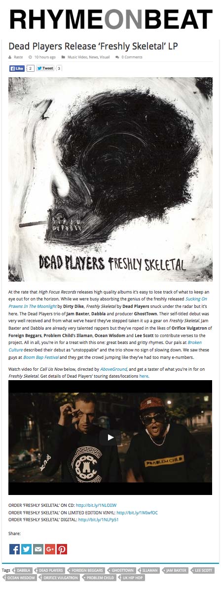 Dead Players – ‘Freshly Skeletal’ – RhymeOnBeat Album Review http://www.rhymeonbeat.com/2015/10/dead-players-release-freshly-skeletal/ High Focus2015-10-29T10:22:05+00:00October 29th, 2015|Dead Players, Press|