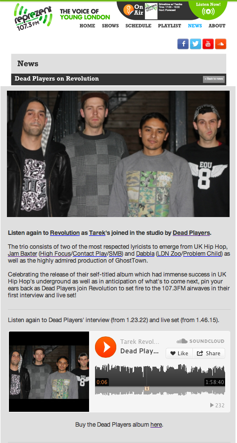 Dead Players – Interview And Live Set On Revolution / Reprezent Radio 107.3 FM Listen to the show here High Focus2013-11-07T17:40:19+00:00November 7th, 2013|Dead Players, Press|