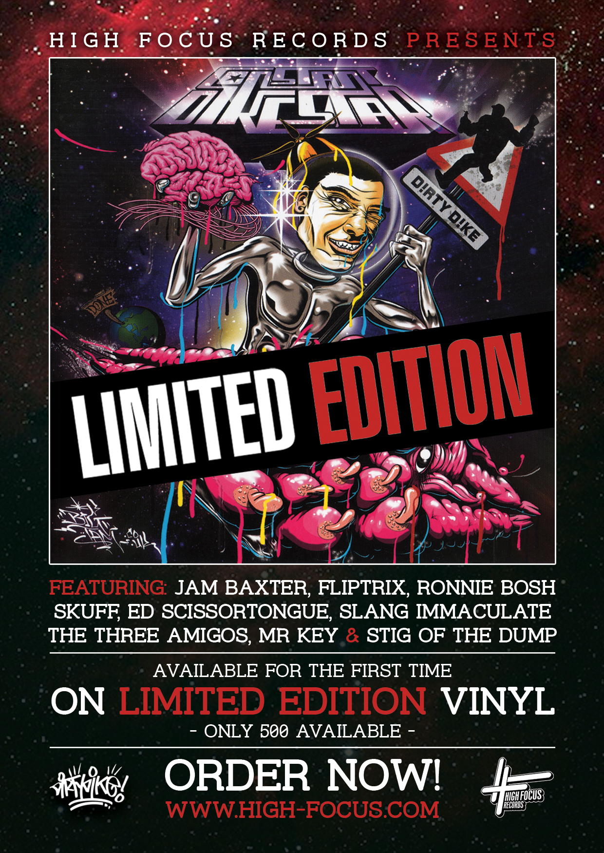 Dirty Dike’s legendary High Focus Records debut ‘Constant Dikestar’, which was only available on CD, is now available on limited edition vinyl! Featuring classics such as ‘Pork Pie’, ‘Hi I’m James’ as well as appearances from Jam Baxter, Fliptrix, Ronnie Bosh, Edward Scissortognue, Mr. Key, Leaf Dog, BVA, Stig Of The Dump and more! This is a must for all High Focus vinyl fiends. Comes shrink wrapped with a full colour sleeve. Limited to 500 copies. Get them while they last, it won’t be long!
