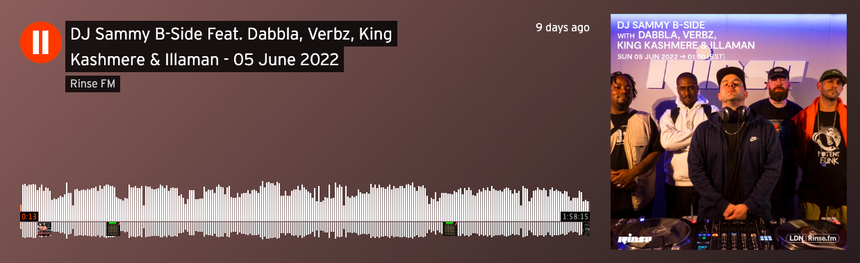 DJ Sammy B-Side kicked off his RINSE FM residency with a stunner of a debut this week. Absolutely crammed with exclusives and featuring a motley crew of HF artists live in the studio (DABBLA, VERBZ, KING KASHMERE & ILLAMAN), the show is a solid reminder of why Sammy is so revered in the scene.