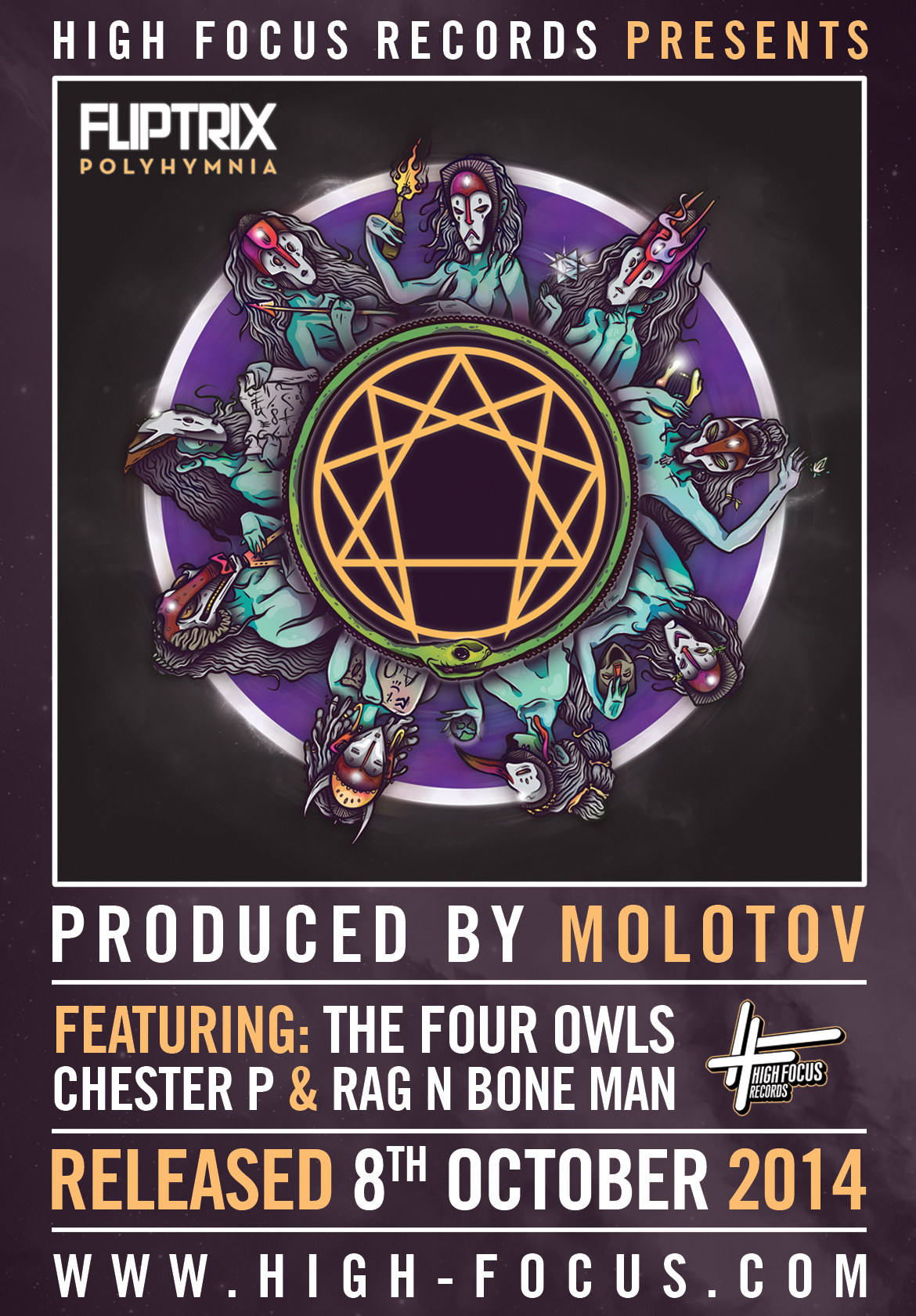 High Focus Records is proud to announce that Fliptrix’s highly anticipated 5th solo album ‘Polyhymnia’, officially dropping on the 8th of October 2014, is now available for pre order. Featuring the likes of The Four Owls, Chester P, Rag N Bone Man and entirely produced by long time collaborator Molotov, this album promises to be some of Fliptrix’s best work to date. The album is available on CD, LIMITED EDITION VINYL & DIGITAL DOWNLOAD.