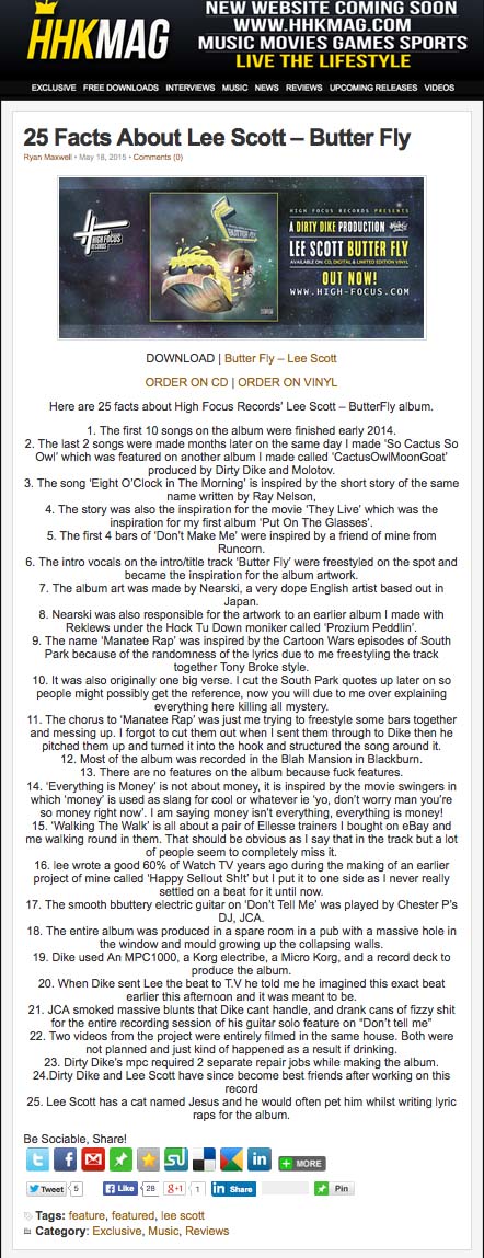 Lee Scott – ‘Butter Fly’ (Prod. Dirty Dike) – 25 Facts with Hip Hop Kings http://www.hip-hopkings.com/2015/05/25-facts-about-lee-scott-butter-fly/ High Focus2015-06-23T11:15:11+00:00June 23rd, 2015|Dirty Dike, Lee Scott, Press|