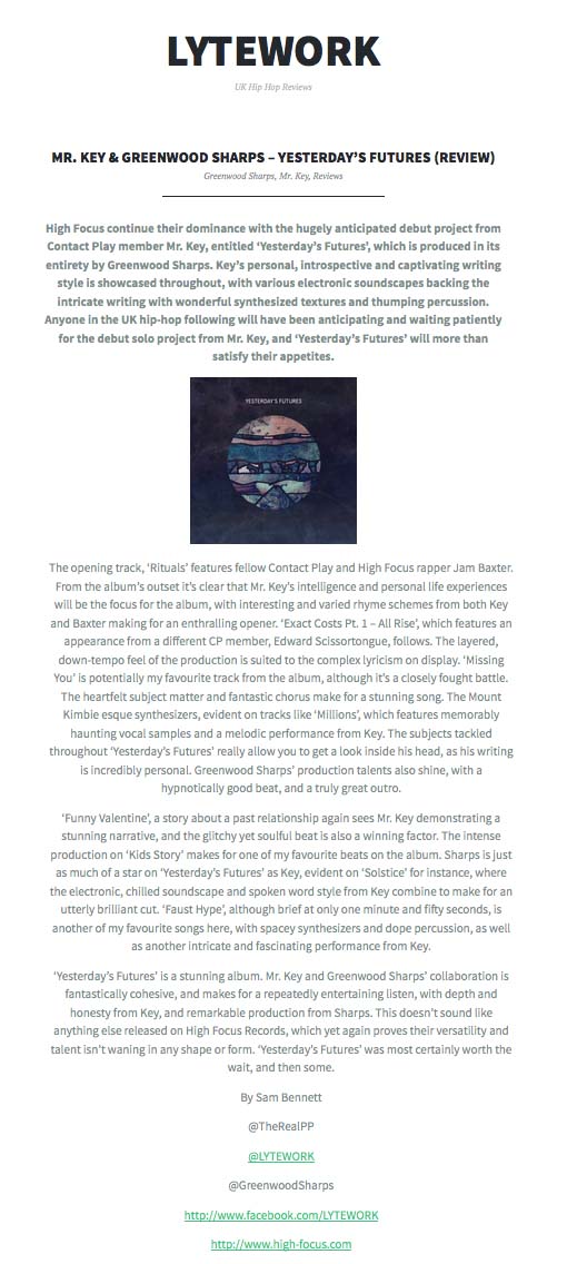 Mr Key & Greenwood Sharps – Yesterday’s Futures – Lytework Album Review https://lytework.wordpress.com/2015/06/10/mr-key-greenwood-sharps-yesterdays-futures/ High Focus2015-06-23T16:13:57+00:00June 23rd, 2015|Mr Key Press, Press|