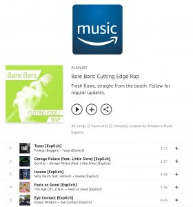 Bare Bars – Cutting Edge Rap #5 – https://music.amazon.co.uk/playlists/B0774SWG67