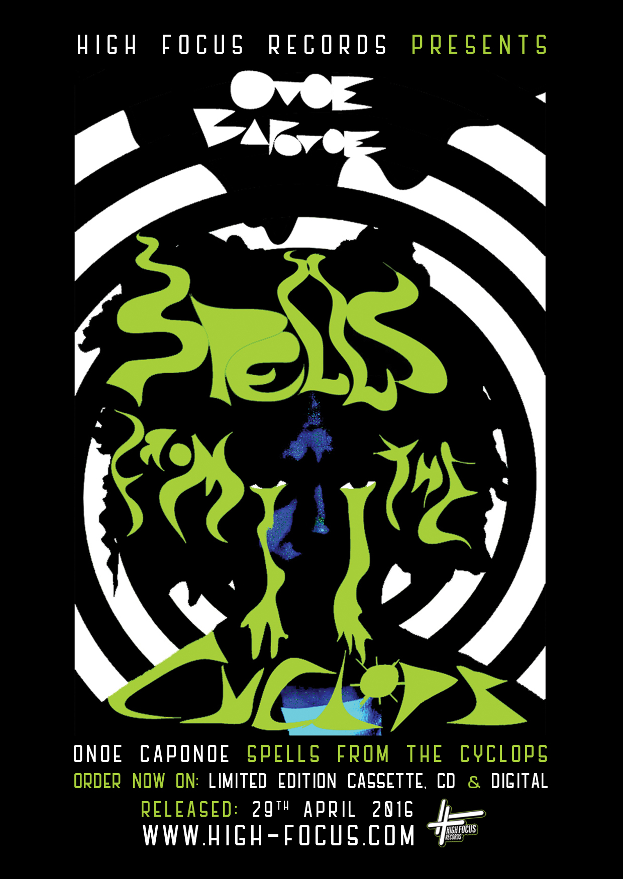 High Focus Records is proud to announce the imminent release of ‘Spells From The Cyclops’ a brand new musical offering by Onoe Caponoe. Picking up where ‘Voices From Planet Cattele’ left off, this new album is a continuation into Onoe’s experimental music universe. The album features stellar production from Lord Catpiss, Drae Da Skimask, Lord Pusswhip, Sumgii and 2Late as well as Vocal performances from Stinkin Slumrok, Bisk, Sendawg, YT & Lauren Auder.’Spells From The Cyclops’ will be made available on SUPER LIMITED hand edition numbered cassette tape (only 100 copies in existence), limited edition CD and unlimited digital. The project shall be officially released on the 29th of April 2016!