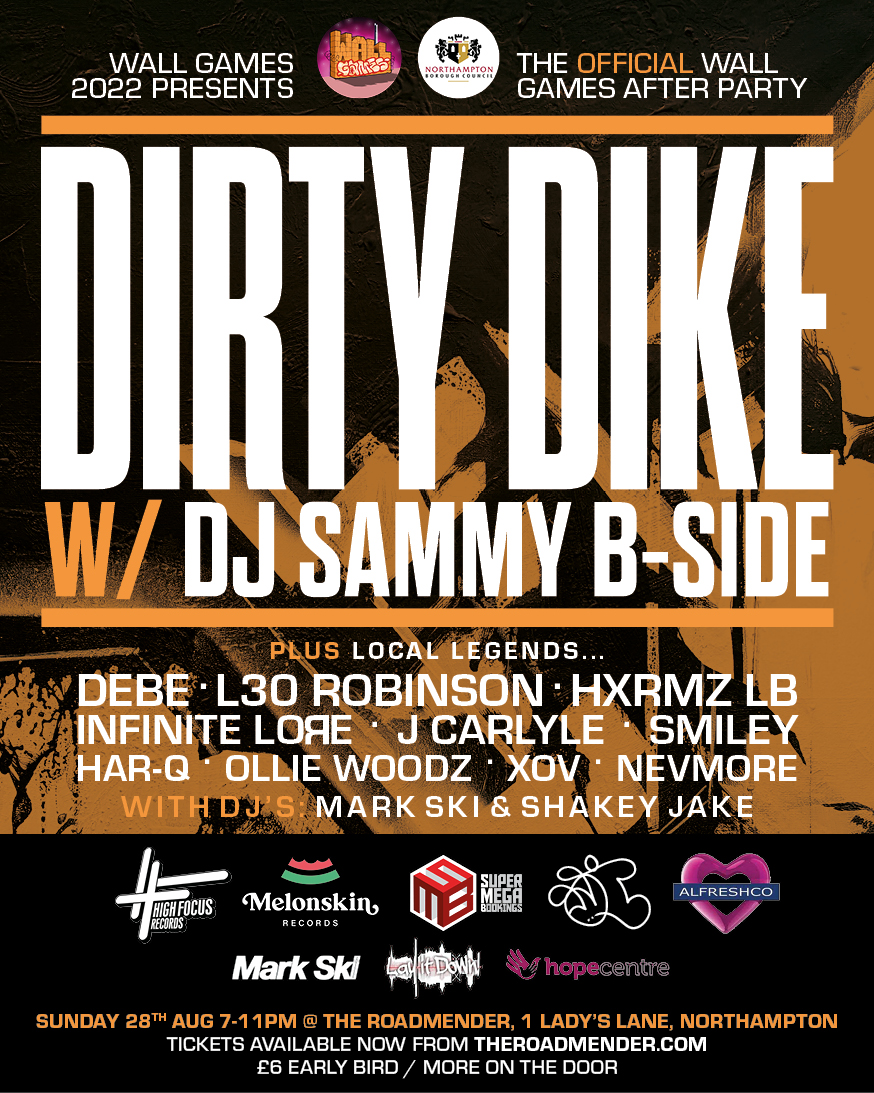 Each year Wall Games assembles some of the U.K.’s top graf artists to unleash their talents on Northampton town centre and create pieces on designated areas and buildings to uplift the area. Catch Dirty Dike & DJ Sammy B-Side at THE OFFICIAL WALL GAMES AFTER PARTY.