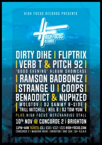 High Focus Records Takeover: Dirty Dike, Fliptrix, Verb T, Pitch 92, Ramson Badbonez, Strange U, Coops, Molotov & DJ Sammy B-Side LIVE @ Concorde 2, Brighton
