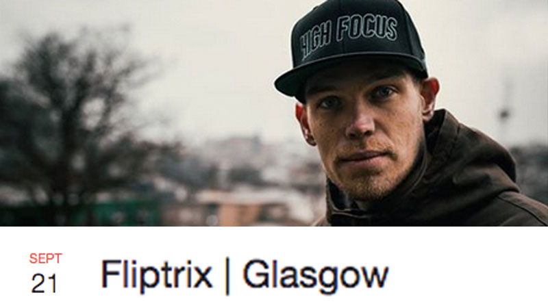 Tickets: https://www.ticketmaster.co.uk/fliptrix-glasgow-09-21-2018/event/360054D5F3AF996C?c=SM_UK_FB_FBOE&camefrom=SM_UK_FB_FBOE Facebook Event: https://www.facebook.com/events/551422251921229