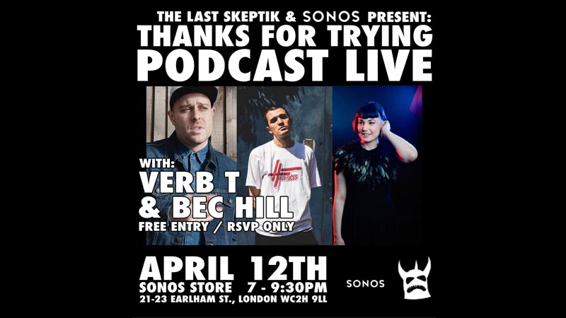 Tickets: https://billetto.co.uk/e/thanks-for-trying-podcast-live-at-sonos-with-verb-t-four-owls-bec-hill-tickets-274336
